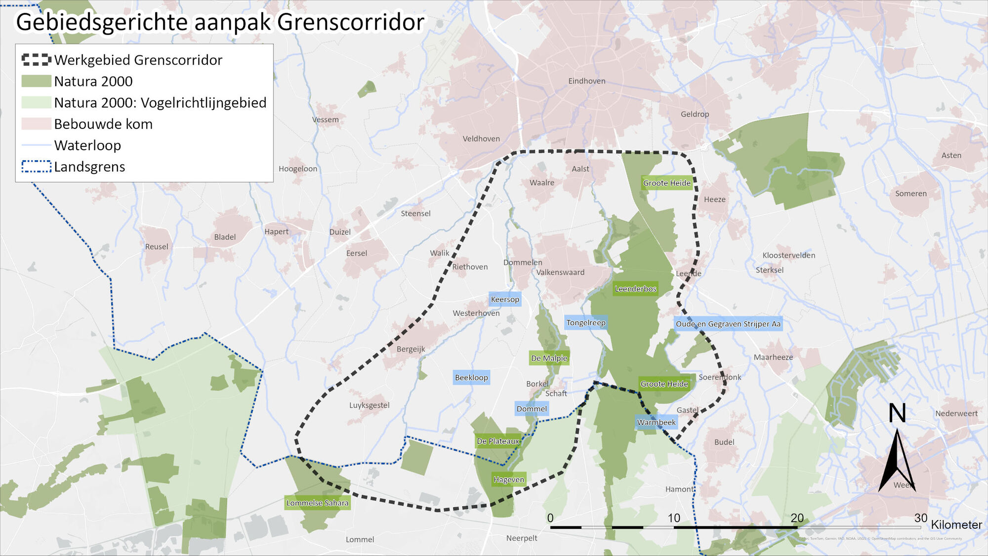 Grenscorridor bevat het buitengebied van gemeenten Cranendonck, Geldrop-Mierlo, Heeze-Leende, Valkenswaard, Waalre en Stad Lommel (B), een groot deel van gemeente Bergeijk en een stukje van gemeente Veldhoven. In Grenscorridor liggen delen van beschermde natuurgebieden, zoals Leenderbos, Groote Heide en De Plateaux. Bos, heide, vloeiweiden en beken als de Dommel, Beekloop, Keersop, de Oude en gegraven Strijpener Aa en Warmbeek bepalen het beeld in Grenscorridor.