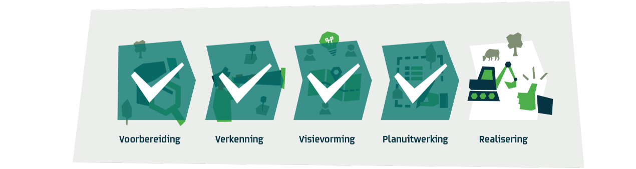 De gebiedsgerichte aanpak Ulvenhoutse Bos doorloopt 5 fases, en zit nu in de vijfde fase: de realisering.