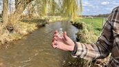 Voorzichtig vult gebiedsmanager Martijn Koobs bij de Valentinuskapel in Westerhoven (Bergeijk) de pen ‘In Goede Handen’ met water uit de Keersop. Namens het programmabureau van gebiedsgerichte aanpak Grenscorridor heeft hij deze waterpen ontvangen uit handen van Anouk van der Poll van de Waterambassade. Wat gaat hij ermee doen?